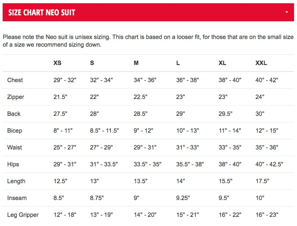 Please note the Neo suit is unisex sizing. This chart is based on a looser fit, for those that are on the small size of a size we recommend sizing down.