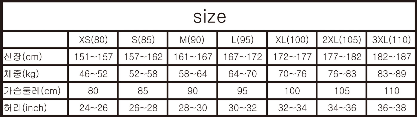 | Size | XS, S, M, L, XL, 2XL, 3XL |