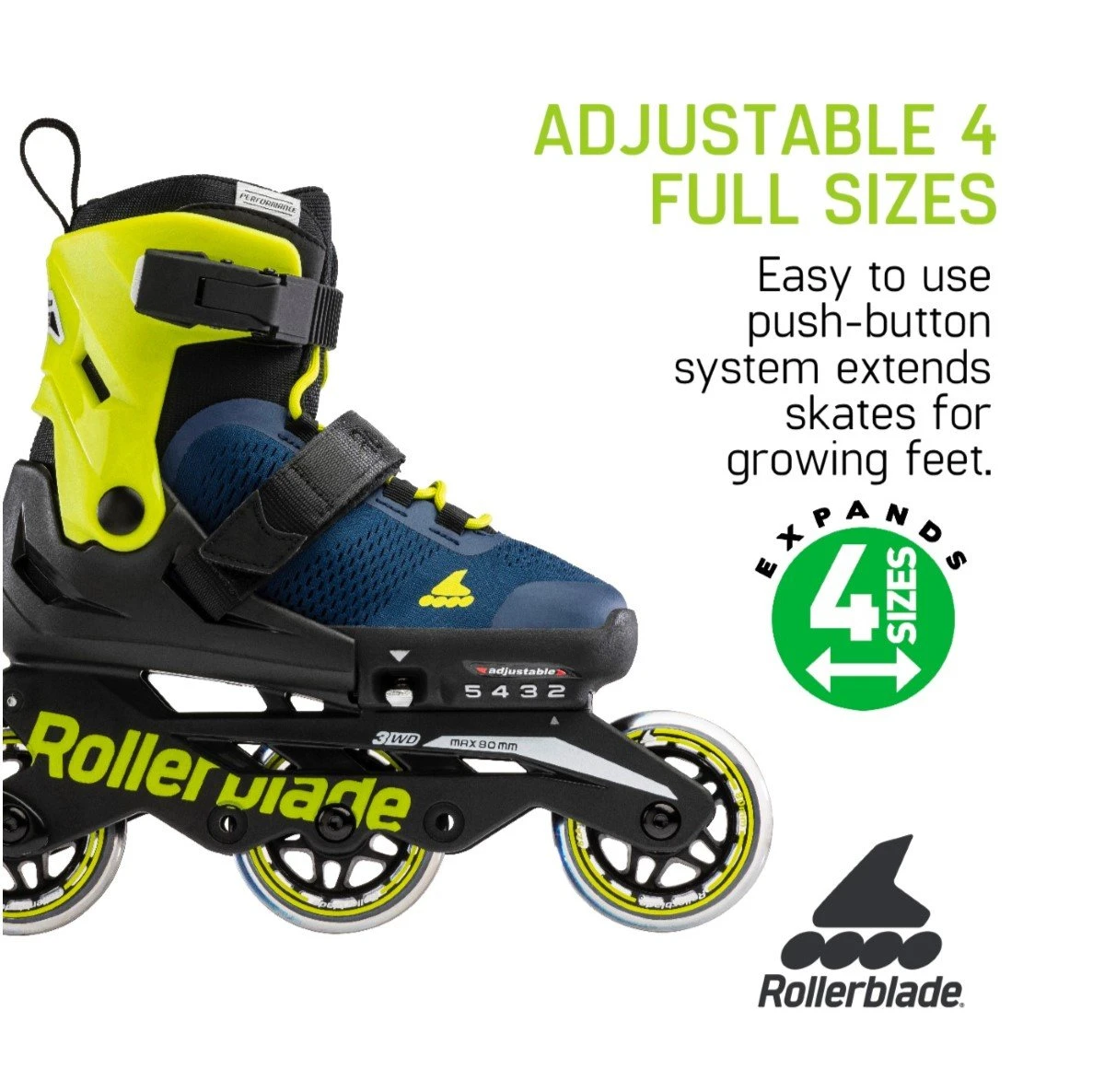 The new Rollerblade Microbladeis a faster, high-quality adjustable skate for kids andexpands four sizes to grow with the childs feet. The ultimate kids skate with a reinforced shell design to help kids with their balance, engineered mesh for a dry fit andfitted as a3 wheel skate.